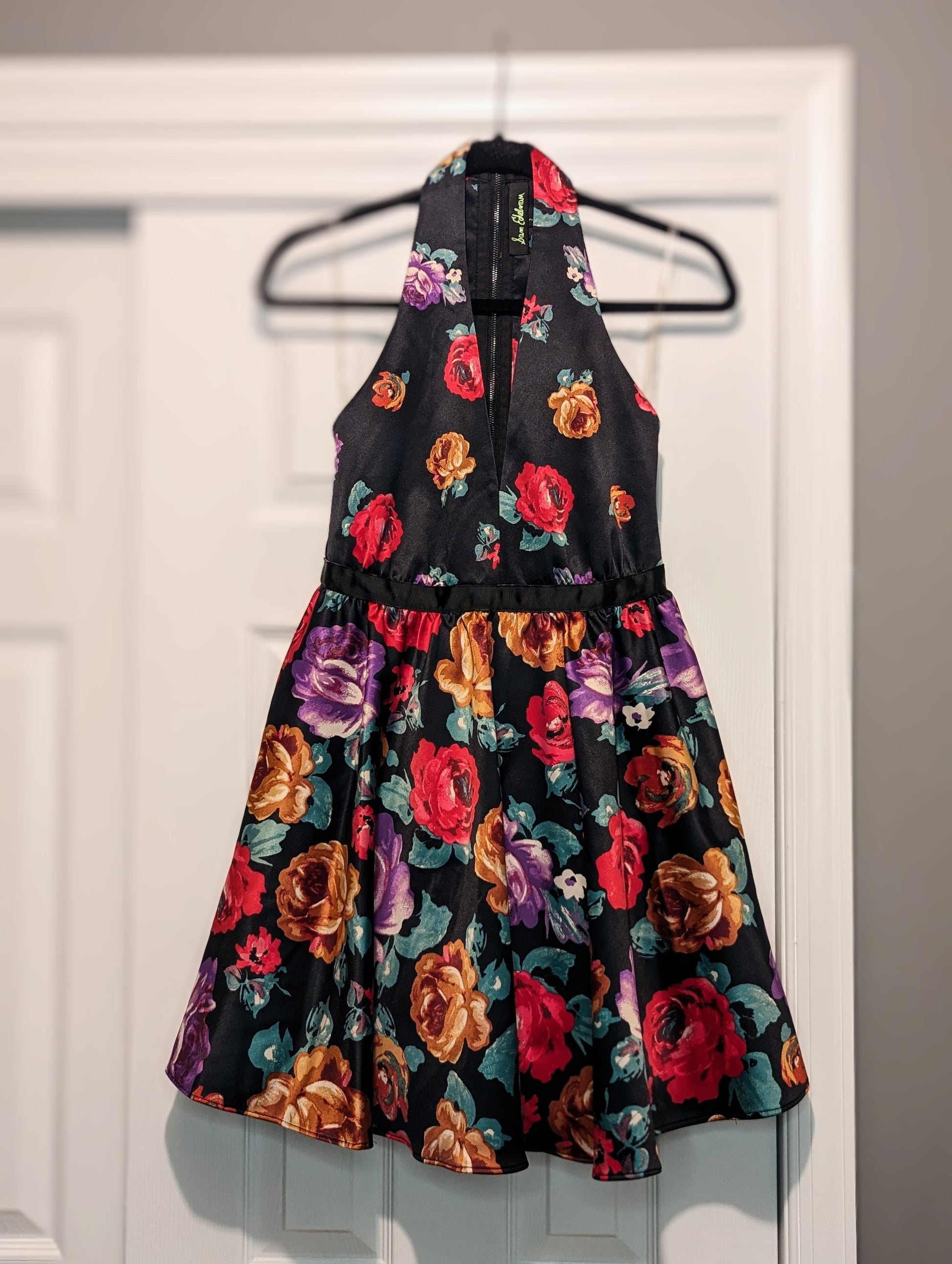Style: Plunging V Neckline Midi Dress with Zippered Black Closure w. Pockets