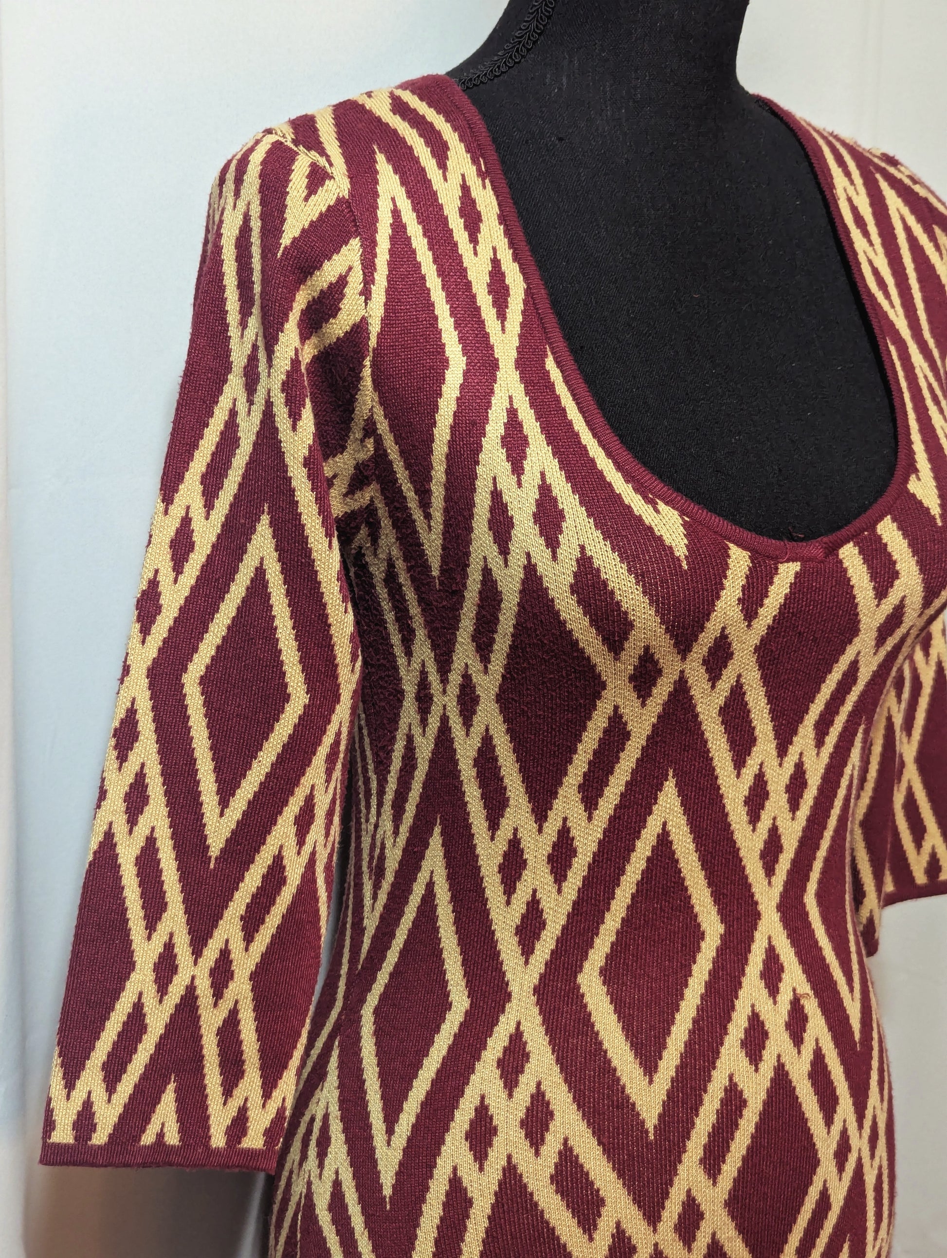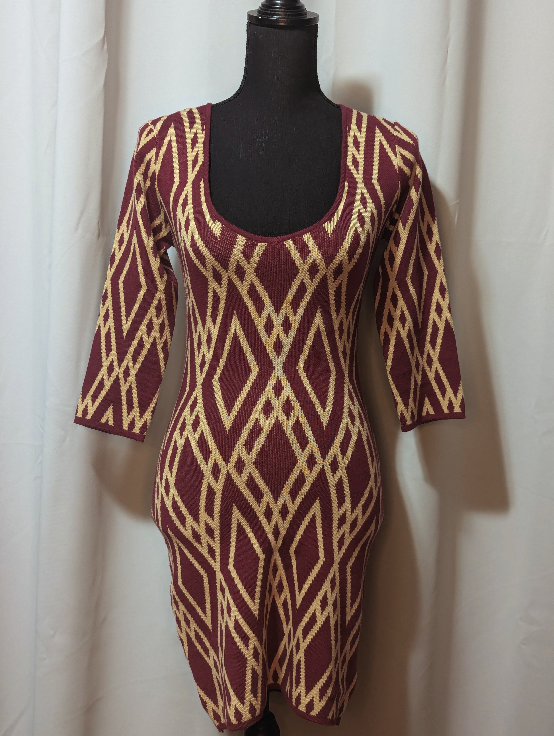 Style: Patterned V Neck 3/4 Sleeve Sweater Dress